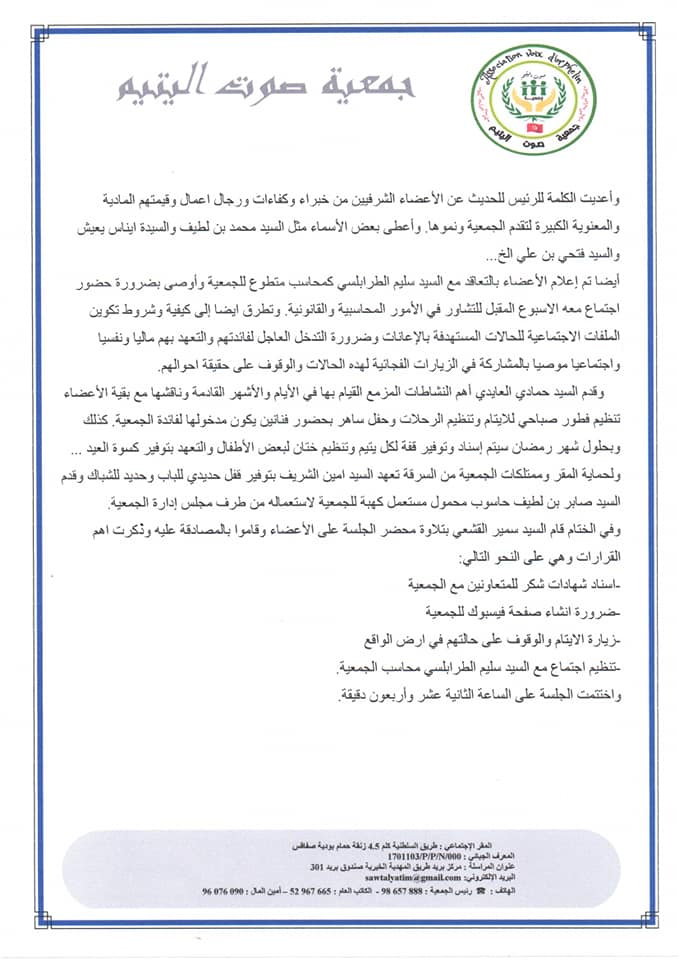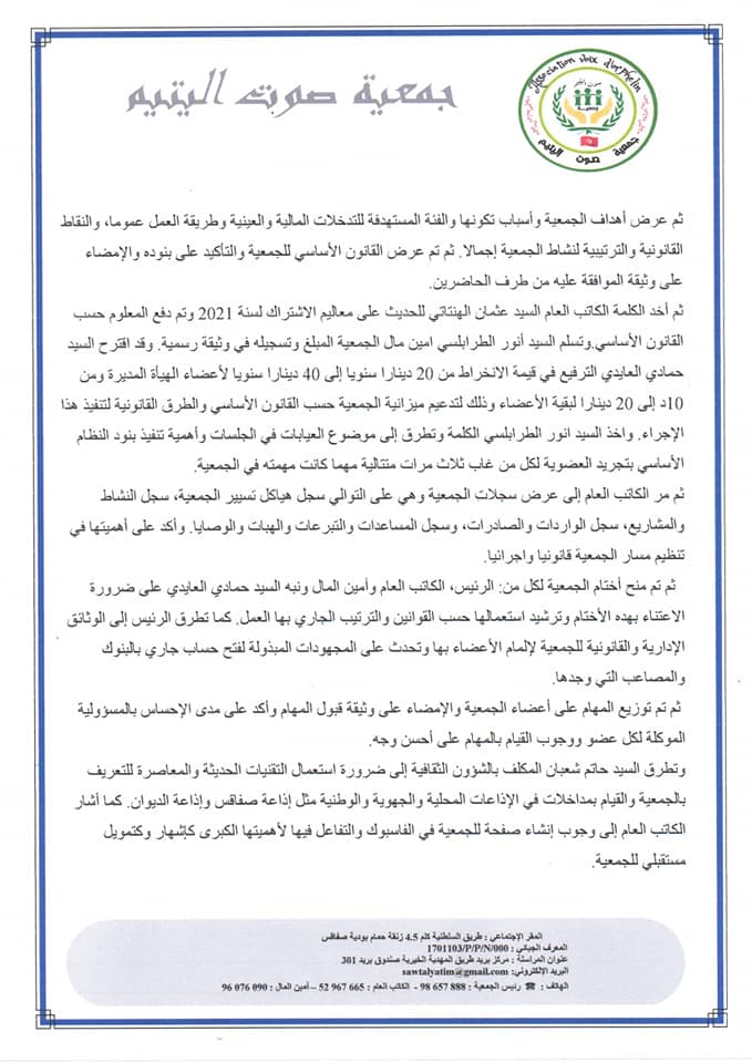 محضر الجلسة العامة الأولى لجمعية صوت اليتيم بتاريخ 14 فيفري 2021